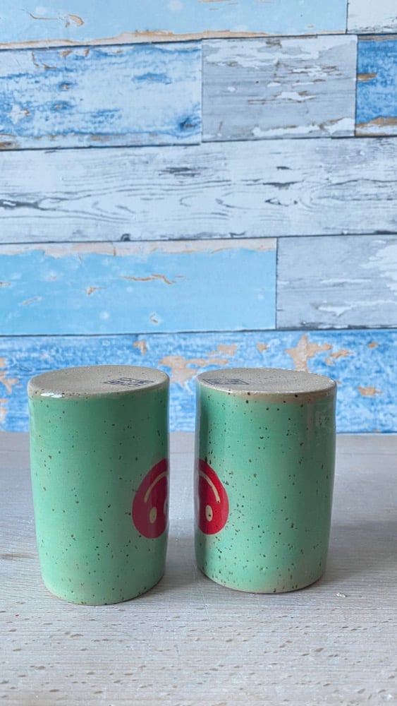 A wash of turquoise/green sits under a cherry red smiley face.